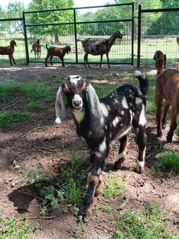 Hermione seems to have a nice wide rump. Teat placement looks good on her udders. She has really pretty pendulous ears. We are excited to watch her grow.